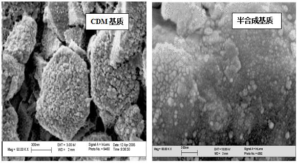 圖1 CDM 基質(zhì)與半合成催化劑基質(zhì) SEM 照片對(duì)比